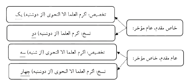 - فرق فرض (۳) و (۴) در آن است که اگر مکلف روز یکشنبه نحوی را اکرام نکرده باشد، مطابق تخصیص نباید آن را قضا کند ولی مطابق نسخ لازم است آن را قضا کند.