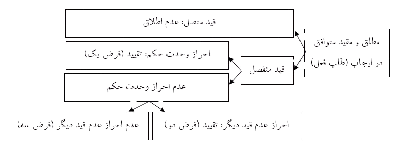 - و در این فرض، چون قید دیگری یافت شده است (مثلاً میدانیم که «صل» که ابتدا مطلق وارد شده، مقید شده است به هنگام مغرب) میتوان گفت ما با دو قید مواجه هستیم که با هم فرق دارند (یکی «صل هنگام مغرب» و دیگری «صل فی المسجد الحرام»)