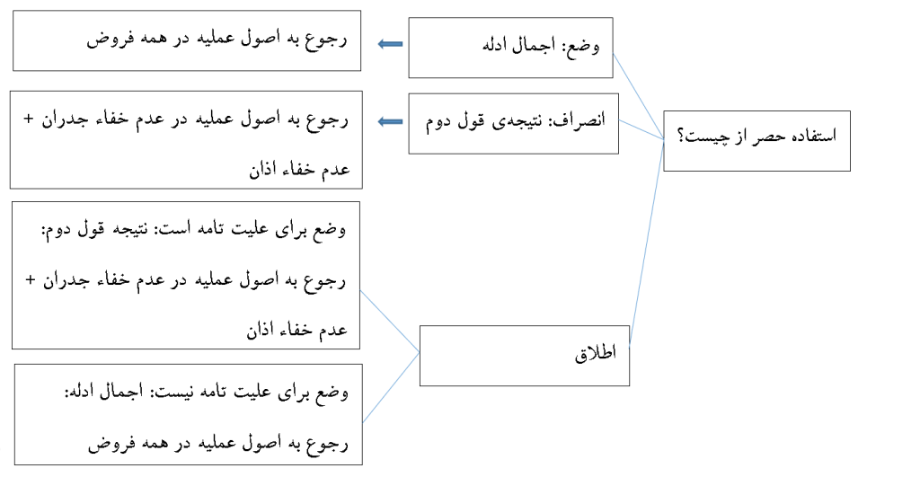 - [ما میگوییم: اگر وضع جمله شرطیه، بر انحصار باشد، روشن است که لازمهی چهار راه اول مرحوم آخوند، آن است که جمله های شرطیه از وضع اولیه خارج شوند و لذا استعمال آنها، استعمال مجازی باشد.[5] اما راه حل پنجم مستلزم آن است که یکی از جمله ها در وضع اولیه باقی بماند و دیگری دارای استعمال مجازی شود. ولی در اینجا هم تعیین مجاز بودن یکی، ترجیح بلا مرجّح است.]