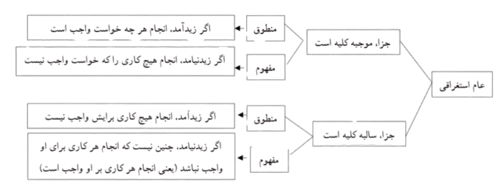 وقتی کسی میگوید «اگر زید آمد، علما را اکرام کن» (و فرضاً 3 نفر عالم در جهان هست)، در حقیقت این جمله میگوید: «اگر زید آمد، عمرو را اکرام کن»، «اگر زید آمد، خالد را اکرام کن»، «اگر زید آمد، بکر را اکرام کن». و در این صورت ما با 3 مفهوم مواجه هستیم: