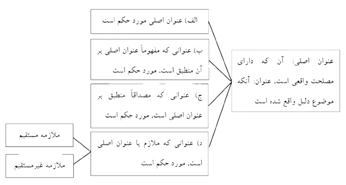 د) ولی گاه یک عنوان فی الواقع مورد حکم است ولی مصداق این عنوان، ملازم با مصادیق، عنوان دیگری هستند. در این مورد شارع به جای اشاره به عنوان اصلی، عنوان دیگری را مورد حکم قرار میدهد. مثلاً آنچه فی الواقع واجب است، اکرام زید است ولی چون زید همیشه همراه عمرو است و اکرام عمرو مستلزم اکرام زید است، لذا شارع امر به اکرام عمرو میکند. (ملازمه) [توجه شود که علت این تغییر عنوانها، گاه به خاطر ابهام در عنوان اصلی است و گاه به سبب دیگری]