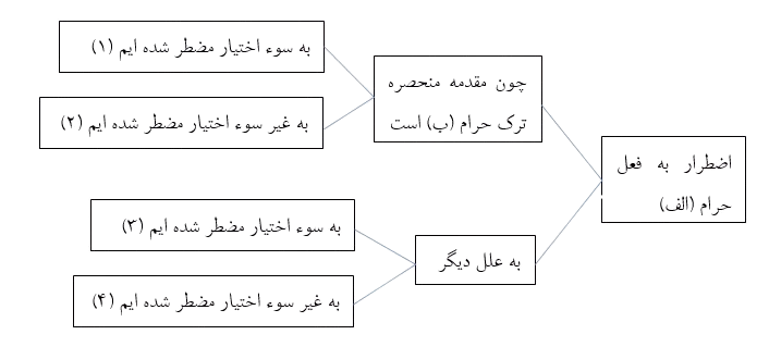 در جایی که ما مضطر هستیم که حرامی (الف) را مرتکب شویم: گاه مضظر هستیم چون باید حرامی دیگر (ب) را ترک کنیم (و این حرام مورد اضطرار (الف)، مقدمه انحصاری ترک حرام (ب) است) و گاه مضطر هستیم به علل دیگر.