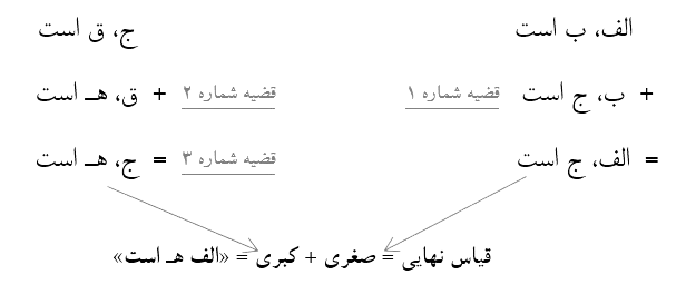 هر قیاسی متشکل از صغری و کبری است. هر صغری و کبری خود در قیاس دیگری ثابت شده اند یا بدیهی می باشند :