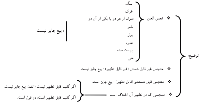 «نجس العين، و هو الكلب و الخنزير، و ما توالد منهما، و ما استحال نجسا، كالخمر، و البول، و العذرة و جلد الميتة، فكل هذا نجس العين، لا ينتفع به، و لا يجوز بيعه.» [21]